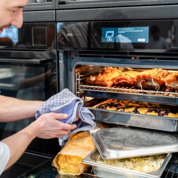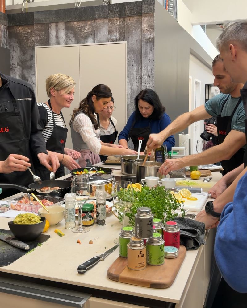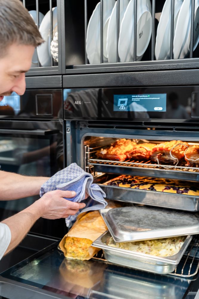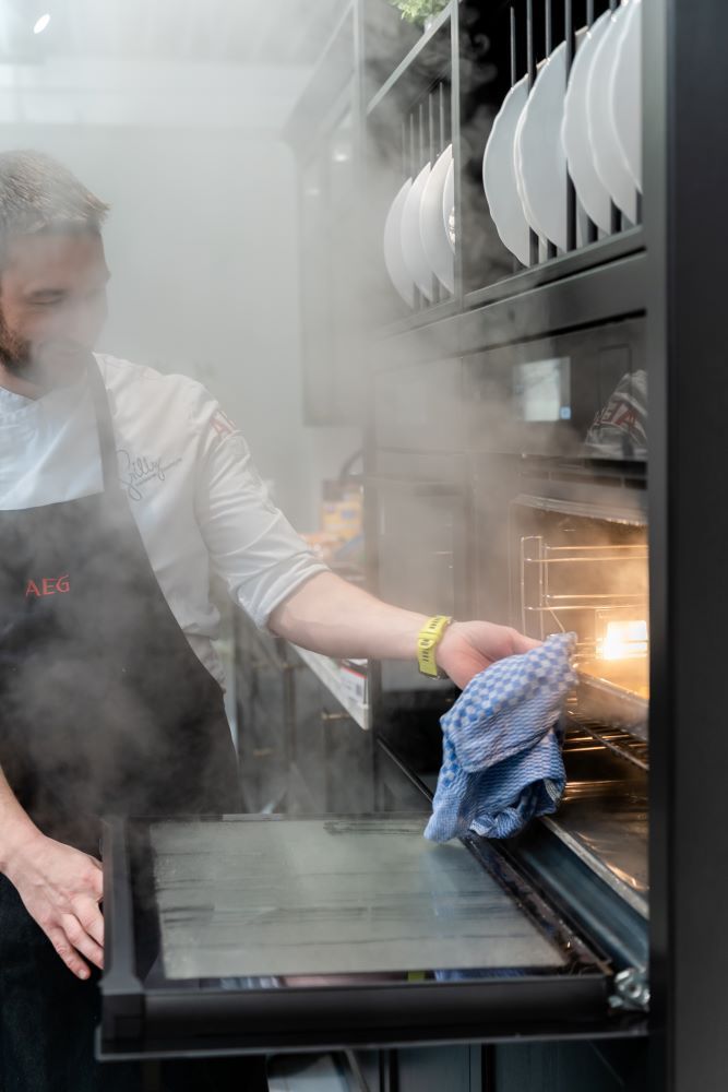Während Grilly vorbereitete und kochte, erklärte er Schritt für Schritt die Möglichkeiten des AEG Dampfbackofens. Die Gäste konnten jeden Handgriff verfolgen, Fragen stellen und sich direkt Tipps für den eigenen Küchenalltag holen. Genau diese Nähe und Offenheit machten das Kochen mit Dampf zu einem lebendigen Programmpunkte unserer Hausmesse.