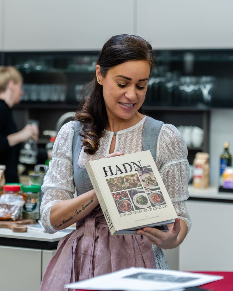 Der erste Workshop stand unter dem Motto „Genial glutenfrei“, inspiriert von Catrins Kochbuch Hadn. Zehn Teilnehmer:innen kochten unter anderem Hadn Cracker, Buchweizenrisotto, Cheesecake sowie Hühnerfilets im Speckmantel und erhielten dabei viele wertvolle Tipps rund um glutenfreies Kochen im Alltag.