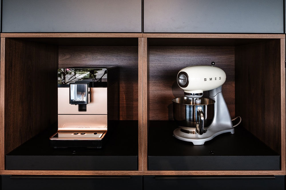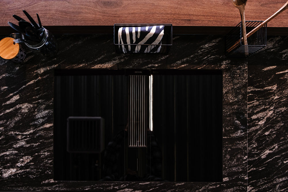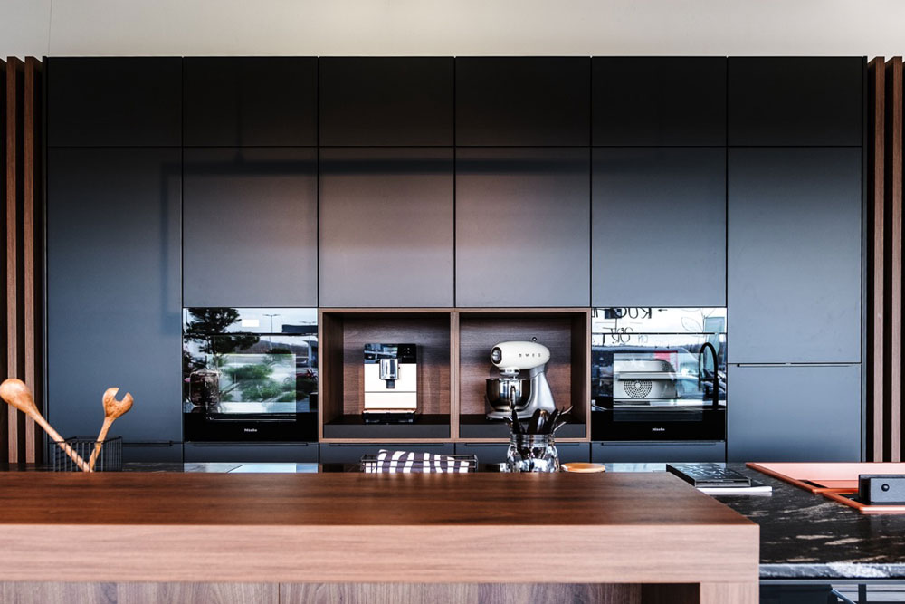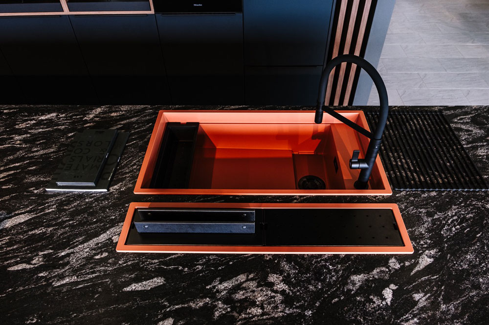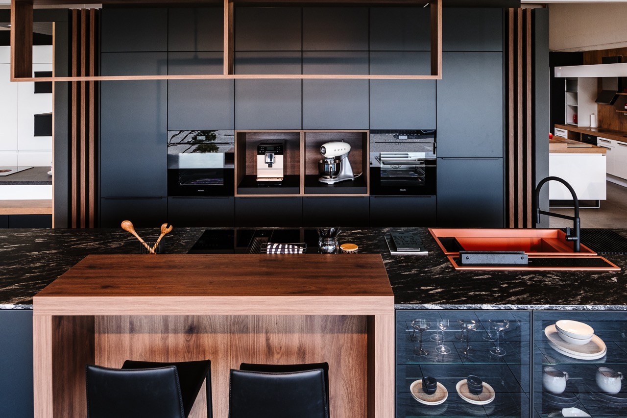 Das Herzstück der Ausstellungsküche „Andros“ ist die beeindruckende Steinarbeitsplatte „Black Scorpion Semigloss“ von Strasser Steine. Diese hochwertige Arbeitsplatte verbindet Robustheit mit einer edlen, semi-glänzenden Oberfläche, die jeder Küche einen luxuriösen Touch verleiht.