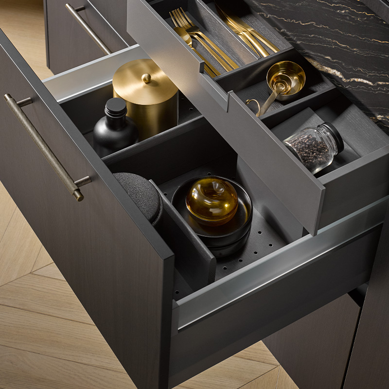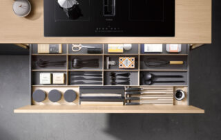 Mit Besteckeinsätzen aus Holz oder Kunststoff bleibt jede Schublade aufgeräumt – egal ob Besteck, Zubehör oder Küchenhelfer. Unsere OrganiQ-Systeme sorgen für klare Linien und elegante Optik.