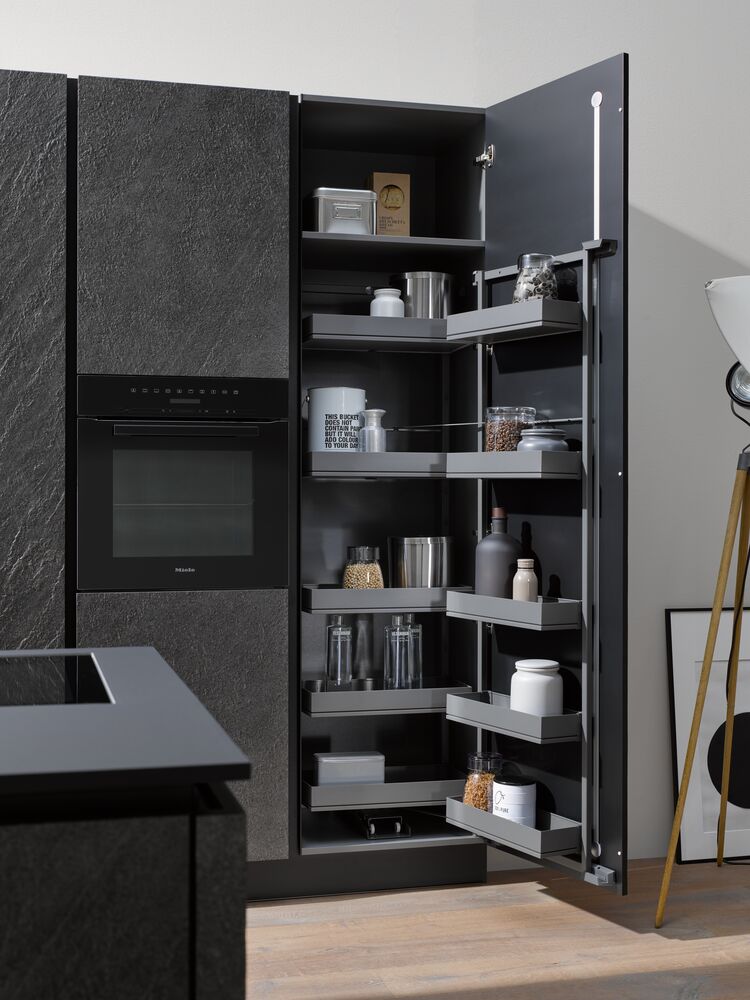 Der Häcker-Vorratsschrank lässt sich komplett ausziehen, sodass du deine Lebensmittel von beiden Seiten siehst. Mehrere Ebenen bieten großzügigen Stauraum, Soft-Einzug sorgt für leises Handling.