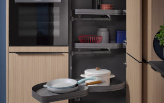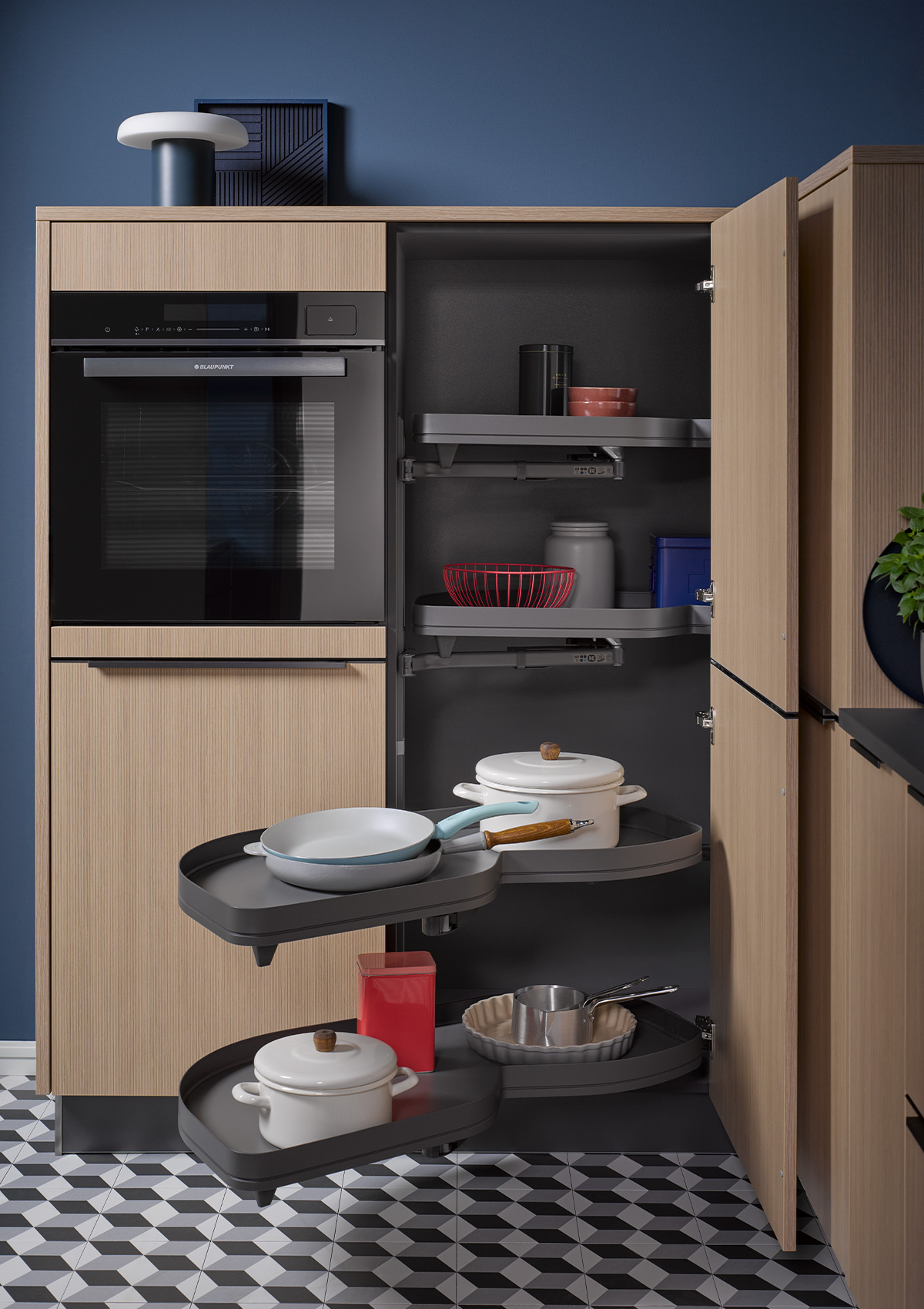 Oft fehlt es nicht am Platz, sondern an der richtigen Lösung. Mit dem LeMans-Schwenkauszug werden Eckschränke zu idealen Aufbewahrungsorten für große Töpfe und Pfannen.
